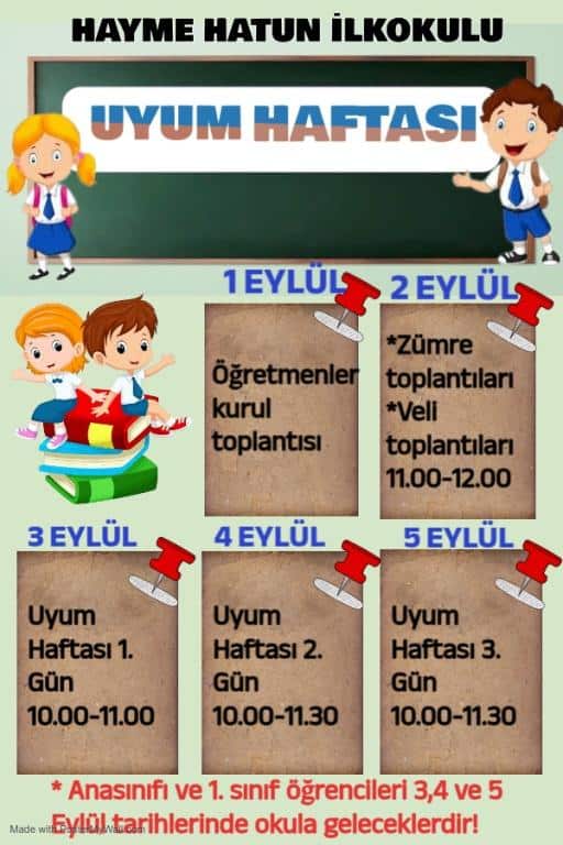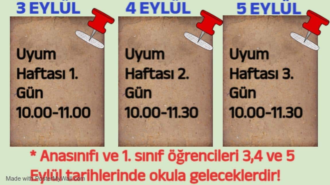Anasınıfı ve 1. sınıflarımız için uyum haftası programımız bu şekilde uygulanacaktır. 2 Eylül Salı günü 11.00'da veli toplantılarımız yapılacak olup, uyum etkinliklerimiz 3,3 ve 5 Eylül tarihlerinde belirtilen saatler arasında gerçekleştirilecektir.